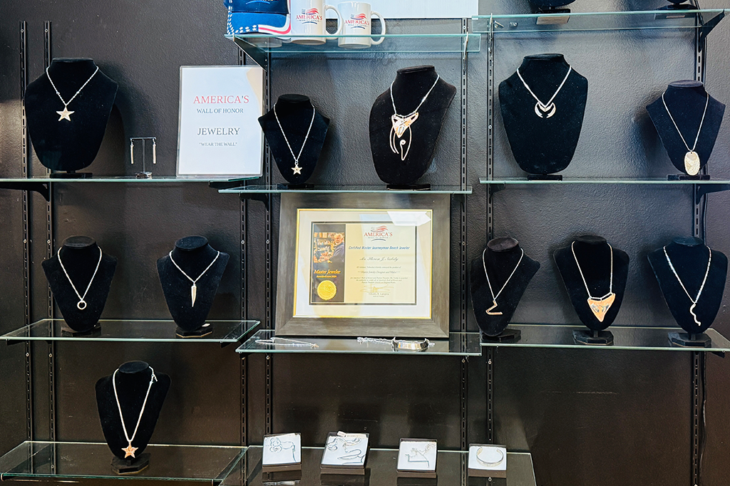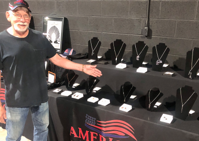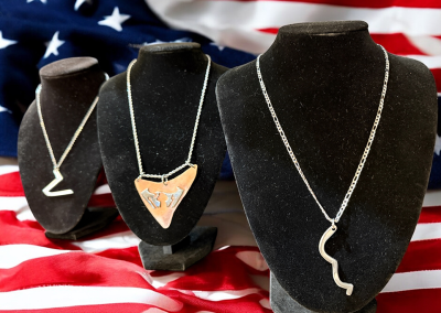The 9 Seals that make up America’s Wall of Honor were made from over 100 sheets of 12 gauge high grade stainless steel. The leftover pieces in manufacturing terms are called “drop” or “rem” (remnant) and usually considered scrap. All the drop from the making of AWoH is considered precious metal. The Patriot Thunder Jewelry line is designed by Master Jeweler Steve Nabity from Ashland, Nebraska. Each piece is hand crafted by Steve and his Artisans.