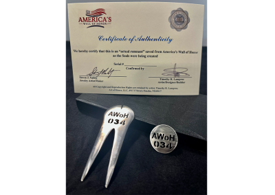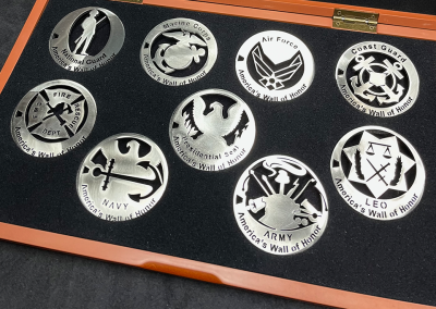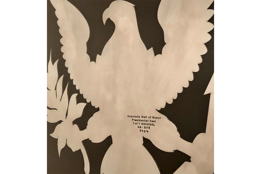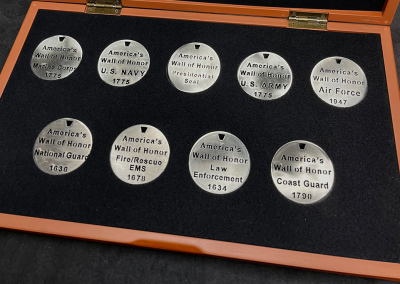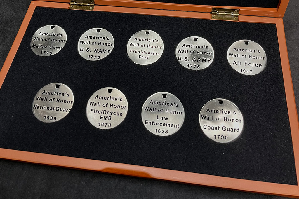 America's Wall of Honor Medals and Key Tags are original designs from memorial artist Timothy R Lampros. The 9 Seals that make up America’s Wall of Honor were made from over 100 sheets of 12 gauge high grade stainless steel. All of the stainless that went into the making of the 9 Seals is considered precious metal. The Medals and Key Tags were cut from the same sheets of stainless steel used to create each of the 9 Seals on America's Wall of Honor that are dedicated to the military and first responders.
