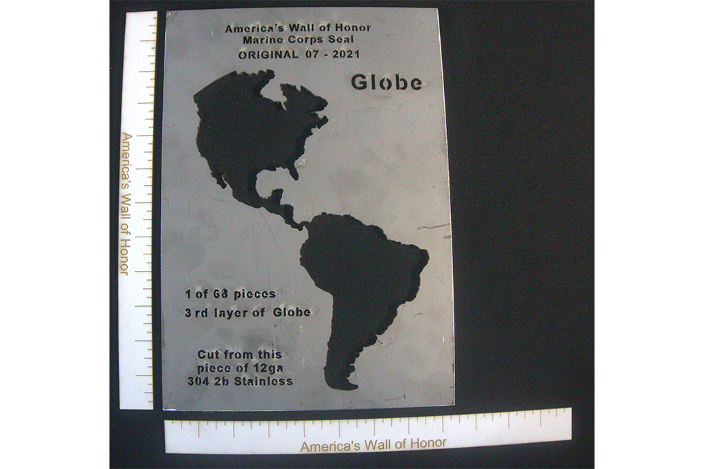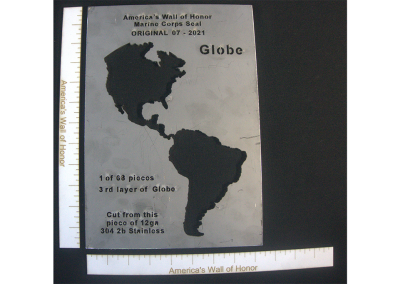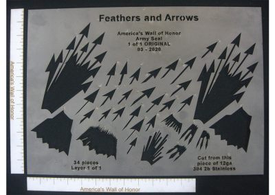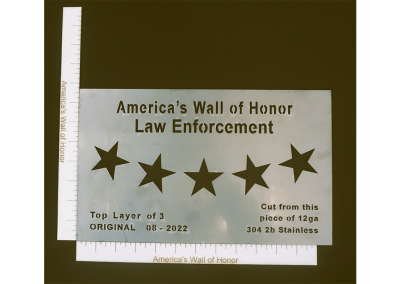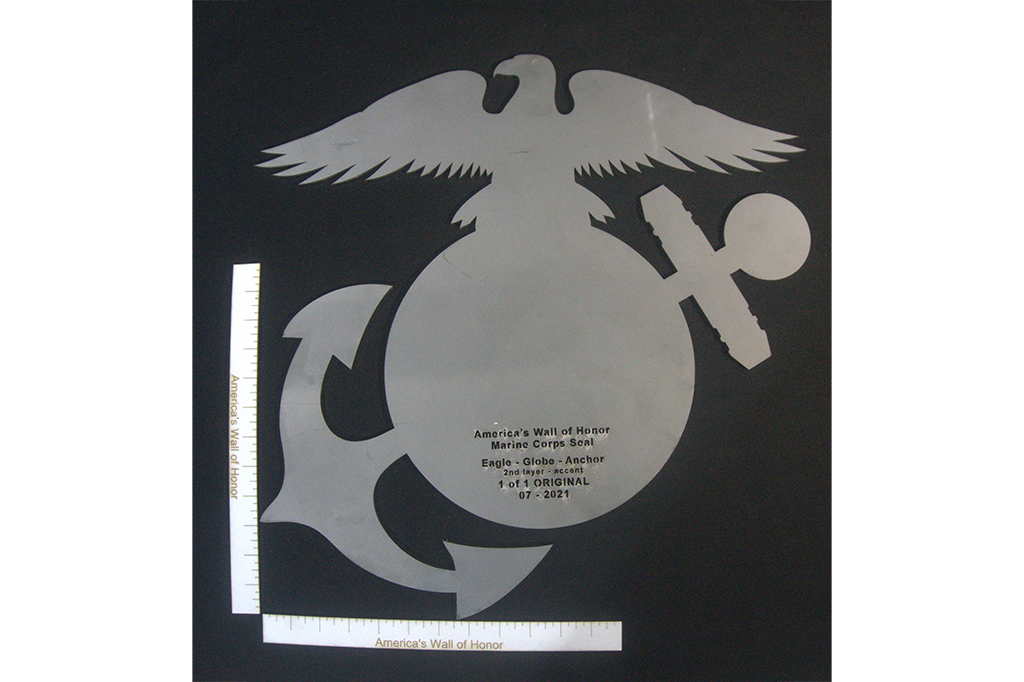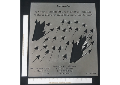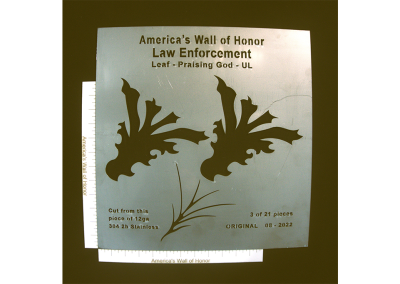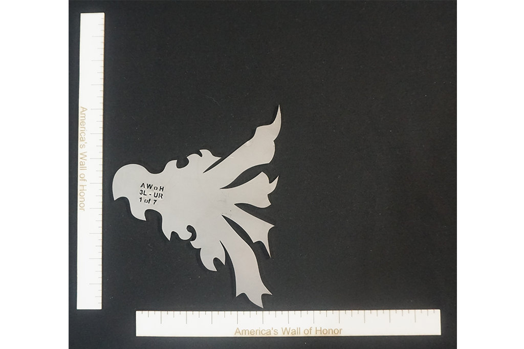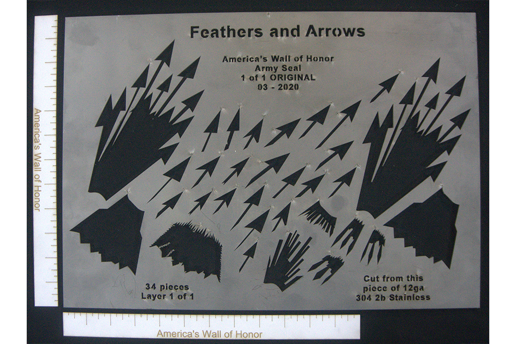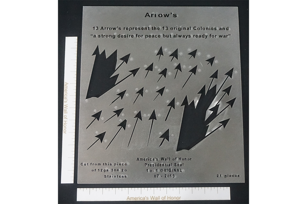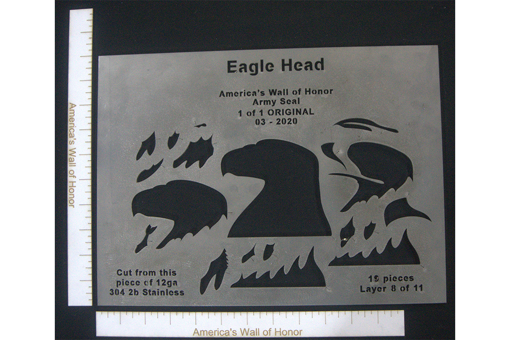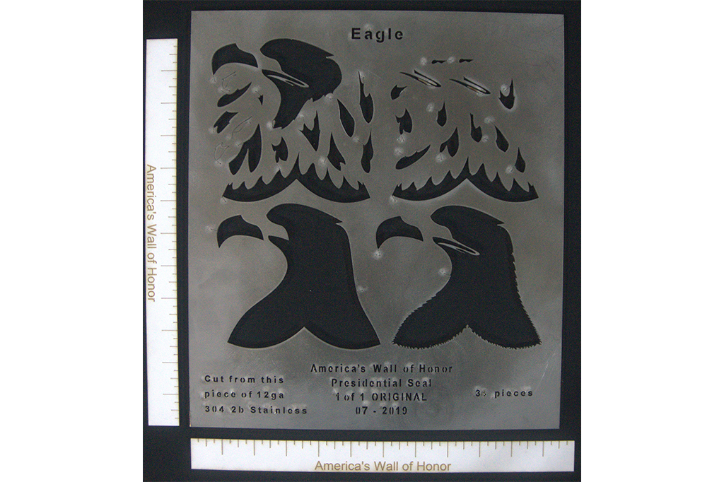 The 9 Seals that make up America’s Wall of Honor were made from over 100 sheets of 12 gauge high grade stainless steel. The technical name of this stainless is 12ga-3042B. The design was to intentionally place a piece that would become part of the Seal into a labeled area that later could become a displayed artifact. A little over 700 Remnant Display pieces were created while building America’s Wall of Honor Seals.