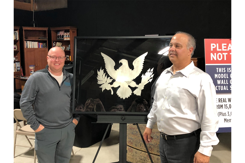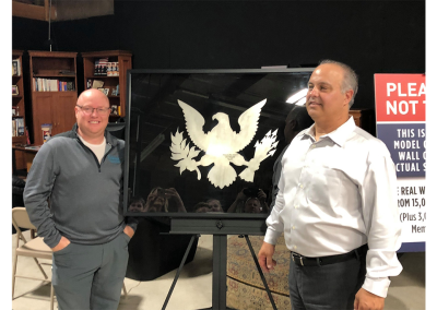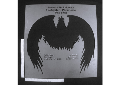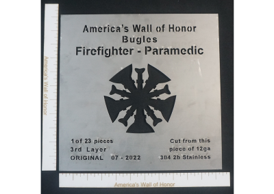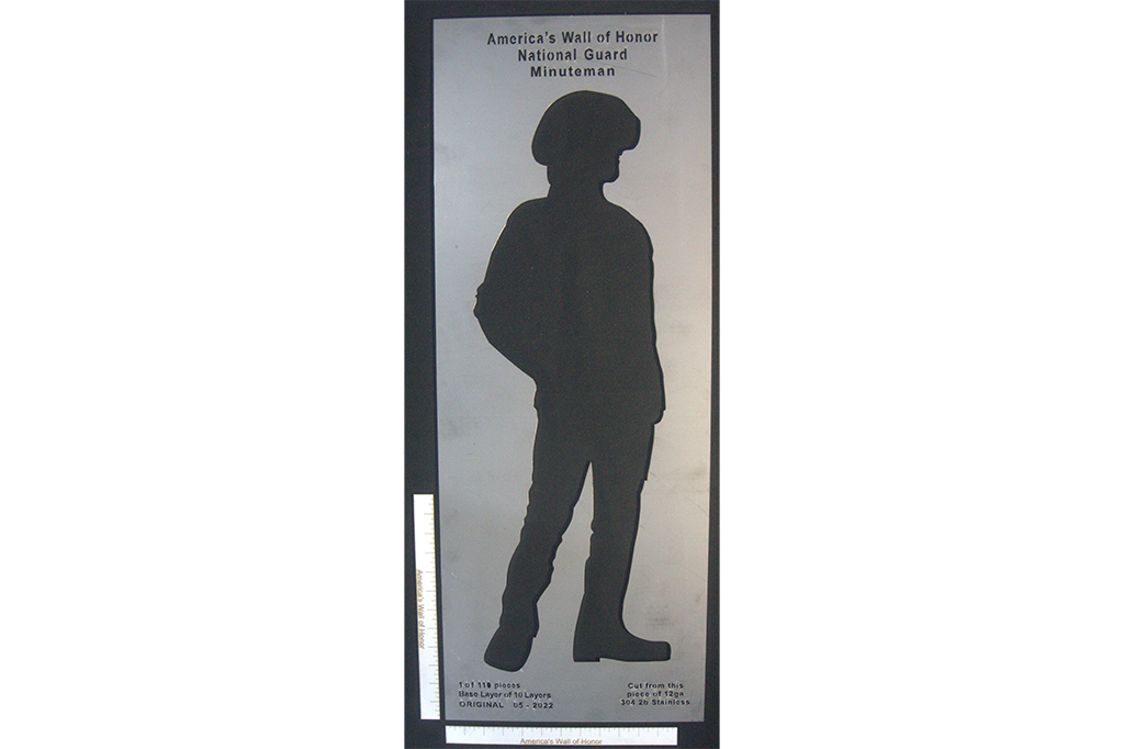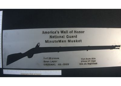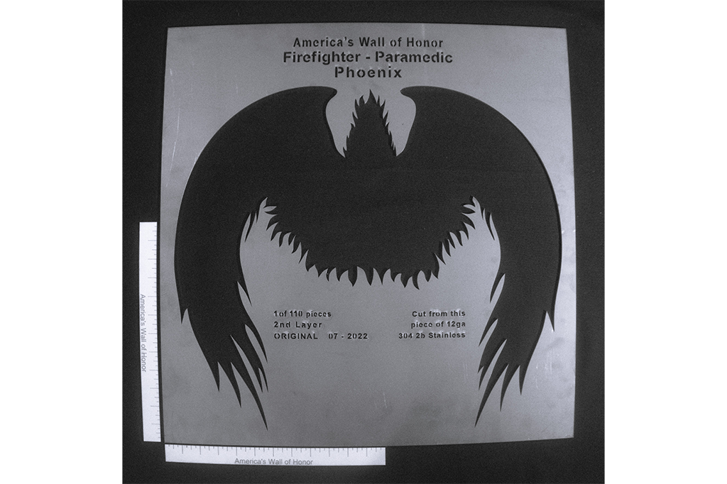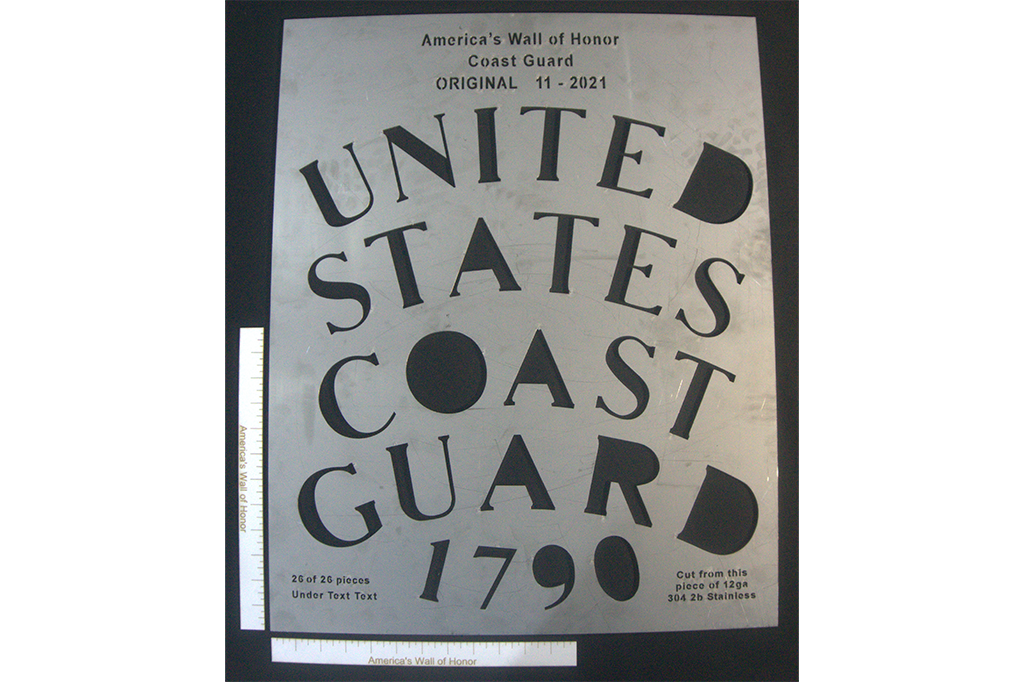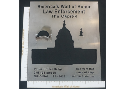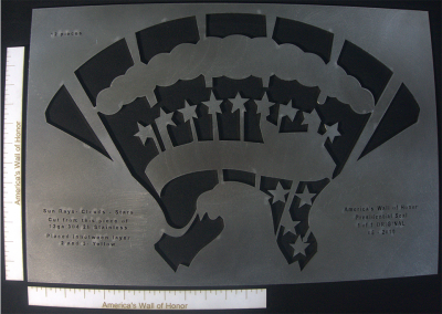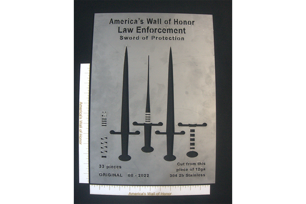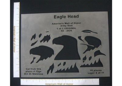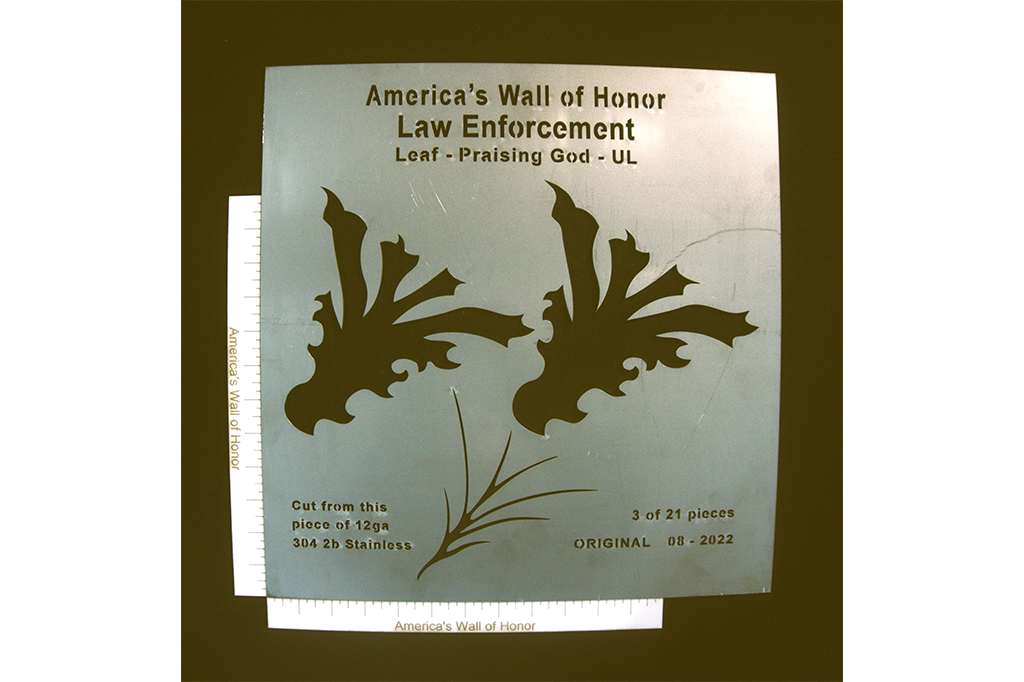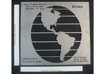 The 9 Seals that make up America’s Wall of Honor were made from over 100 sheets of 12 gauge high grade stainless steel. The technical name of this stainless is 12ga-3042B. The design was to intentionally place a piece that would become part of the Seal into a labeled area that later could become a displayed artifact. A little over 700 Remnant Display pieces were created while building America’s Wall of Honor Seals.